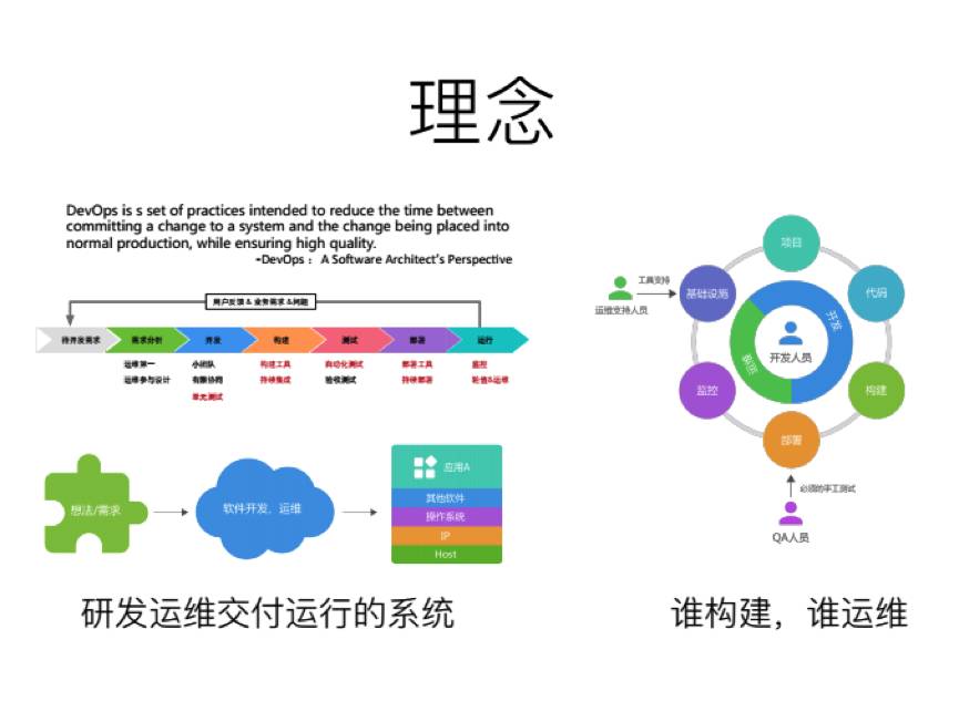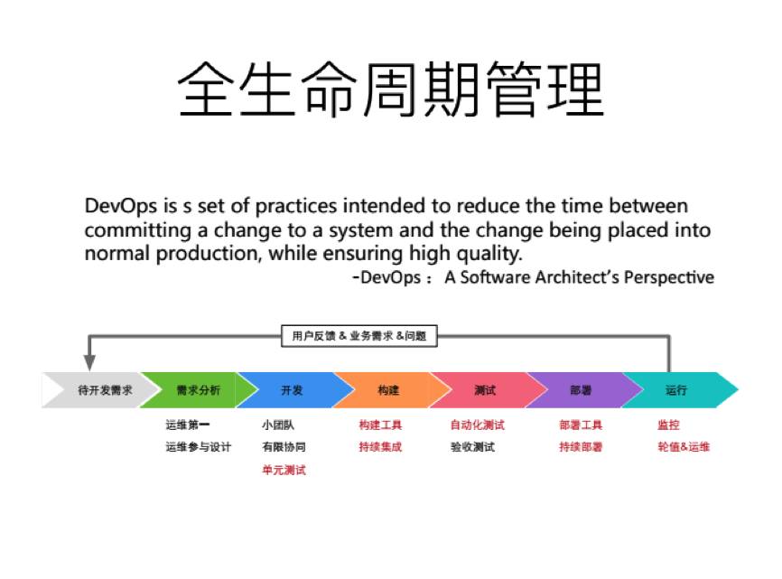 在此基础上,区别于DevOps所强调的相关团队协同合作,我们更强调开发承担运维、测试的工作,也就是谁构建谁运维,让开发做上线部署、运行监控、系统稳定性优化等等工作,而运营人员应该更专业化,提供专业性的支持和相关运维工具。