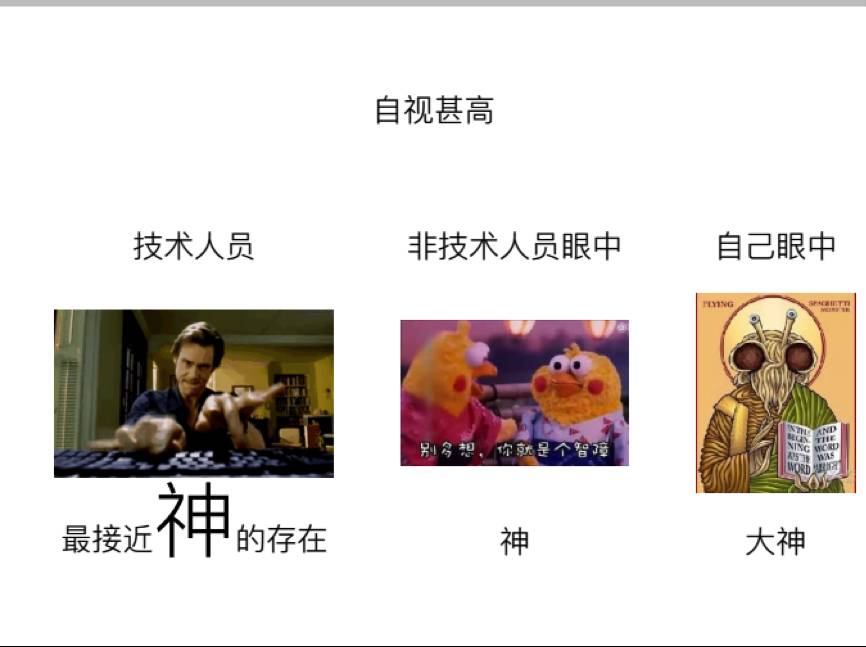 这是我们工具的主要用户。当分析技术人员时,会发现他们都自视甚高,尤其是研发人员,在自己眼中什么都能做,比如项目管理时,研发人员的预估永远是乐观的:没问题,都可以完成。