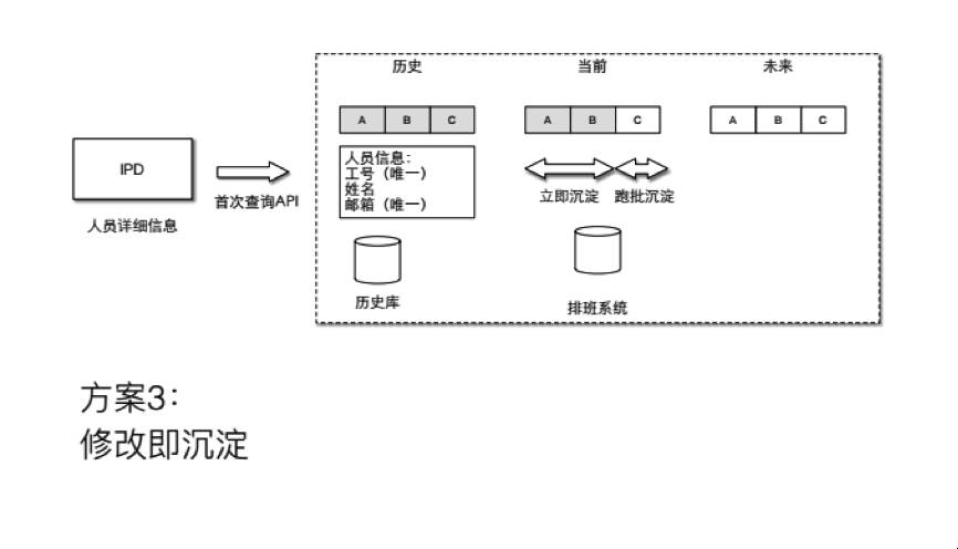 研发人员给出的方案二无法接受,因为当删掉一个人时,所有东西都会被删除。如不要实时查询,缓存数据即可。历史数据按照跑批沉淀,如按照周去沉淀,在生成排班表时将信息抓取,落到历史库里,基本信息常用信息也会同步保存。