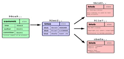 为直观起见,我们假设在工作目录中有三个文件,准备将它们暂存后提交。暂存操作会对每一个文件计算校验和(即SHA-1 哈希字串),然后把当前版本的文件快照保存到 Git 仓库中(Git 使用 blob 类型的对象存储这些快照),并将校验和加入暂存区域。现在,Git 仓库中有五个对象:三个表示文件快照内容的 blob 对象;一个记录着目录树内容及其中各个文件对应 blob 对象索引的 tree 对象;以及一个包含指向 tree 对象(根目录)的索引和其他提交信息元数据的 commit 对象 。