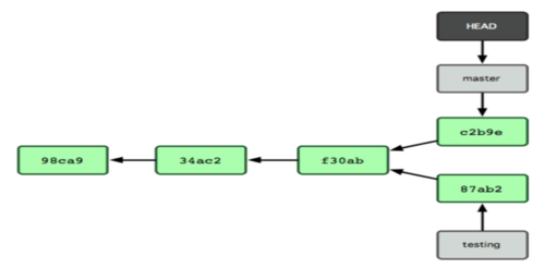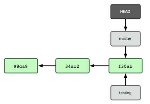 Git 通过个git branch命令创建分支,比如新建一个testing分支: