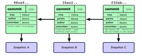 在 Git 中提交时,会保存一个提交(commit)对象,它包含一个指向暂存内容快照的指针,作者和相关附属信息,以及一定数量(也可能没有)指向该提交对象直接祖先的指针:第一次提交是没有直接祖先的,普通提交有一个祖先,由两个或多个分支合并产生的提交则有多个祖先。