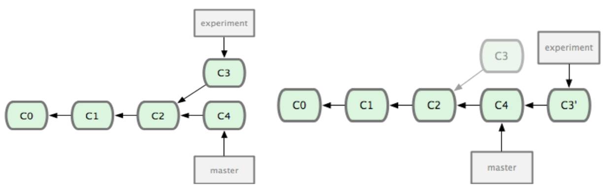 其实,合并两个分支还有另外一个选择:你可以把在 C3 里产生的变化补丁重新在 C4 的基础上打一遍。在 Git 里,这种操作叫做衍合(rebase)。有了 rebase 命令,就可以把在一个分支里提交的改变在另一个分支里重放一遍。