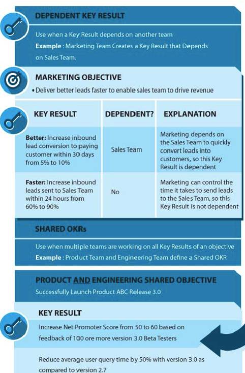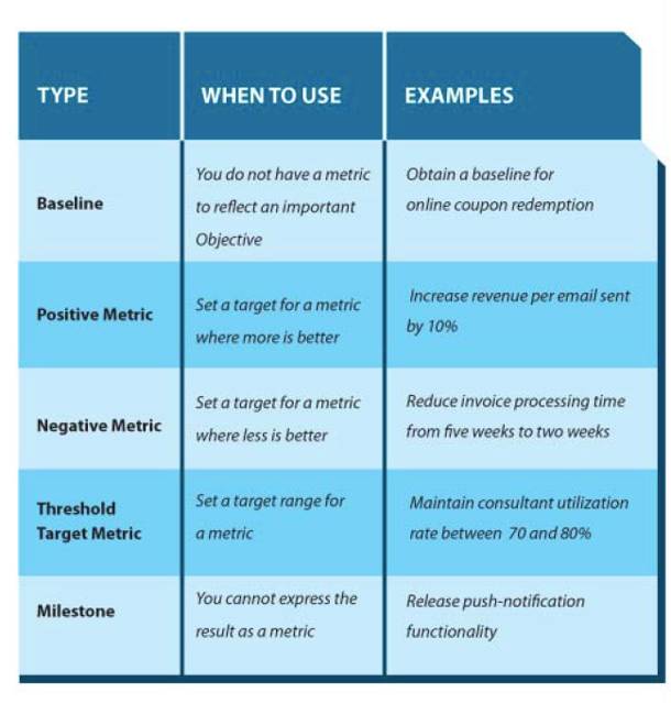 关键结果是对实现目标的一个定量的描述。如果目标是描述“我们要做什么?”,那么关键结果是回答“我们怎么知道我们实现了目标?”