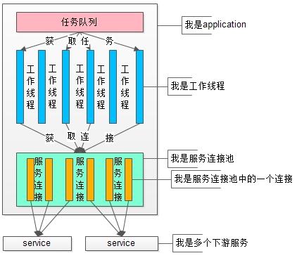(3.2)中间是工作线程【或许web-server的工作线程或者cgi工作线程帮你干了线程分派这个事情了】,每个工作线程完成实际的业务任务,典型的工作任务是通过服务连接池进行RPC调用