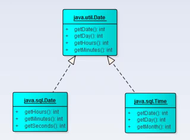 注:java.util.Date这个类不仅提供了日期功能,如getDate(),getYeah()等方法,还提供了getTime(),getHours()等时间方法,但是它的二个子类java.sql.Date不支持与时间有关的功能,而java.sql.Time不支持与日期有关的功能,于是java.sql.Date拒绝了从超类继承的所有与时间有关的方法,java.sql.Time拒绝了继承的所有与日期有关的方法。