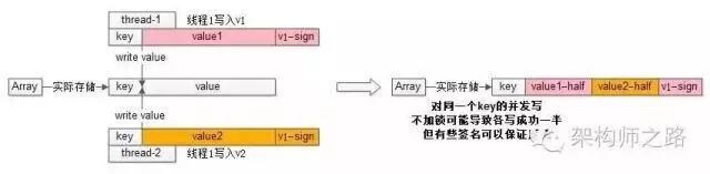 3)如果不加锁,线程1和线程2对同一个定长区域进行一个并发的写操作,可能每个线程写成功一半,导致出现脏数据产生,最终的结果即不是value1也不是value2,而是一个乱七八糟的不符合预期的值value-unexpected,但签名,一定是v1-sign或者v2-sign中的任意一个
