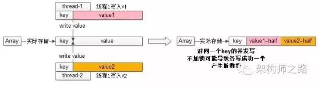 3)如果不加锁,线程1和线程2对同一个定长区域进行一个并发的写操作,可能每个线程写成功一半,导致出现脏数据产生,最终的结果即不是value1也不是value2,而是一个乱七八糟的不符合预期的值value-unexpected。