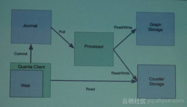 客户端写日志到一个journal系统,数据处理Processor从journal系统不停pull数据然后分别更新图和counter存储服务,客户端从counter服务读数据,写操作是追加数据到journal服务,update操作是以thrift message的形式来封装的,所以可以支持各种各样的client;Processor是stateless的异步服务,可以批量读取数据并做处理;counter存储服务用的是HBase,理由是每个计数都可以利用column family字段来保存若干个时间窗口的数据,比如一天的、一周的等等,而且schema还可以随时改变,当设置TTL的时候数据还可以自动过期,吞吐量也足够大;图服务用的也是HBase,每一个row就是图的一个edge,column family存储的是入边和出边,而且通过设置bloom filter还可以实现negative查询,这些模型都比较适合图运算。