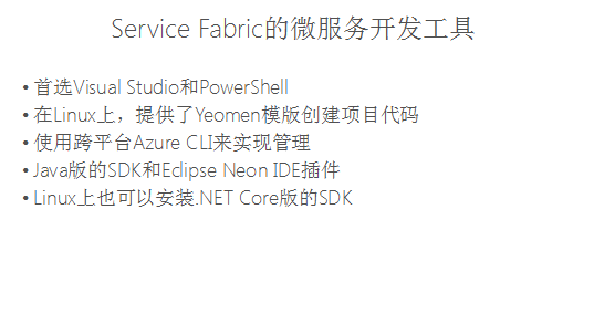 支持.NET和Java的编程模型;支持任意语言的可执行应用;支持Azure部署、其他云平台部署、本地数据中心部署;SDK和本地模拟器支持Windows和Linux上的.NET和Java,Mac
