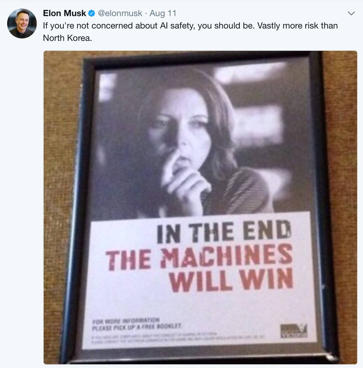 这是比特大陆芯片研发总监谢丹向新智元投来的稿件的开头。仿佛是为了配合这段话,马斯克在推特上又更新了状态,这次他说:如果你还没开始担心人工智能的安全问题,那该开始担心了。人工智能比朝鲜“更危险”。