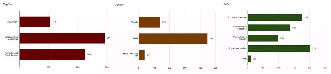 受访者构成(从左到右):地域、性别和角色。17% 来自亚太地区,美洲 36%;72% 为男性;教授 28%,研究生 32%。