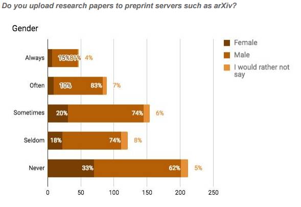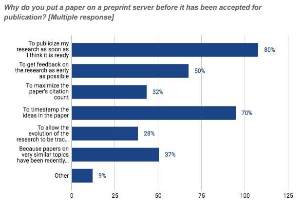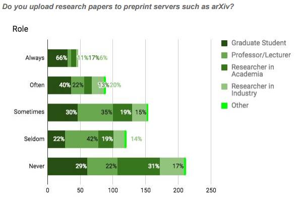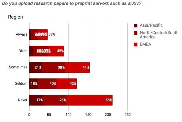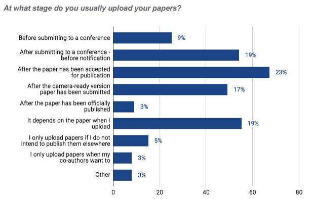 不愿意将论文放在预印刷服务器上的作者,多是因为打算在会议或期刊上发表,并希望确保双盲评审制度。而经常将研究论文放在预印服务器上的作者,有 28% 的人倾向于在接到通知前就上传,另外 43% 的人愿意等到论文被接收后再上传。那些还没接到通知就上传论文的人主要是想宣传自己的研究,或者是想抢论文发布的时间点(自己最早发表)。
