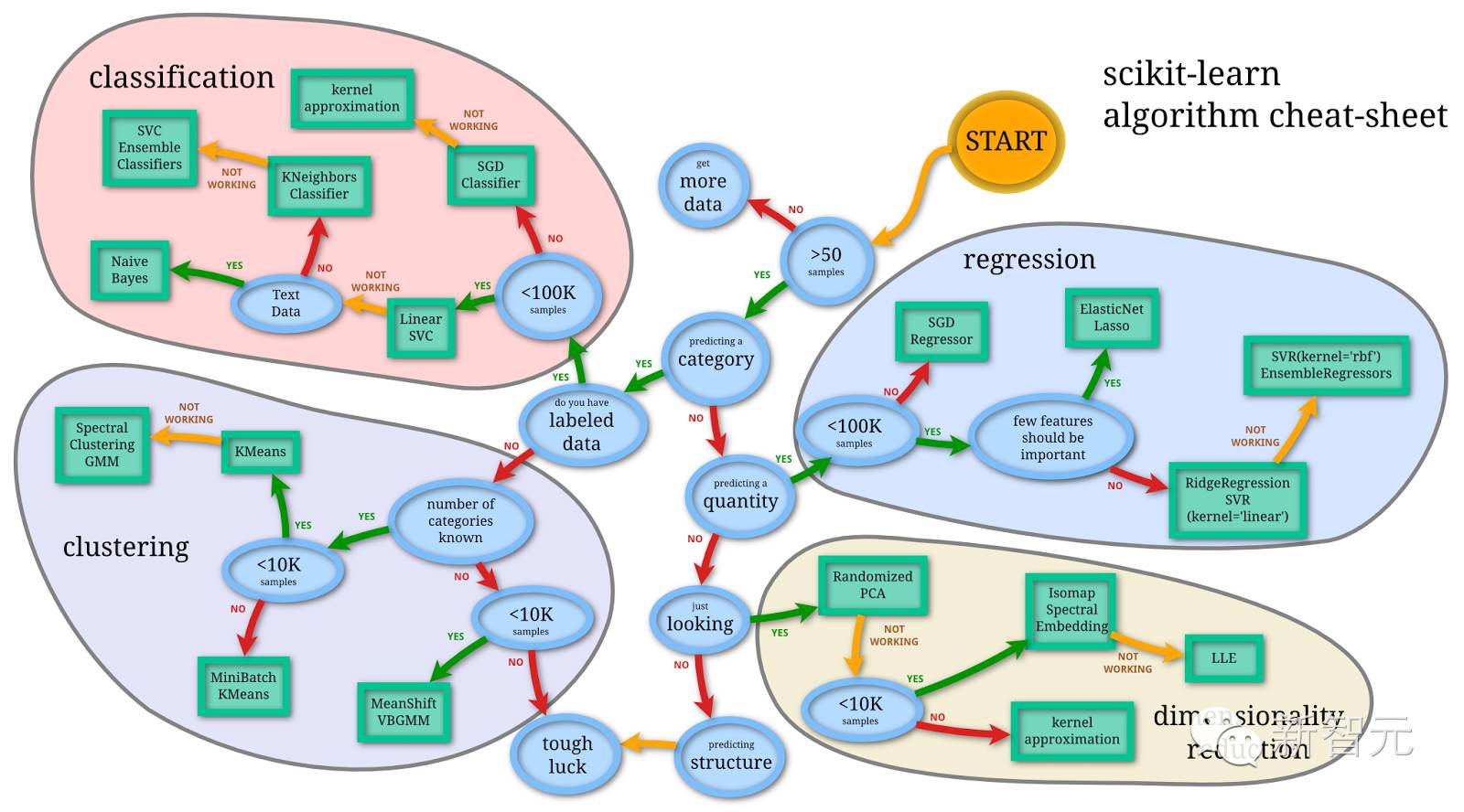 为了避免重复,本文将只在最适合的地方列举一次。下面的算法和分类都不齐备,但有助于你了解整个领域大概。(说明:用于分类和回归的算法带有很大的个人主观倾向;欢迎补充我遗漏的条目。)