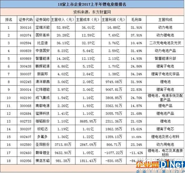 记者梳理总结了坚瑞沃能、国轩高科、比亚迪、中信国安、智慧能源、鹏辉能源等18家锂电池A股上市企业2017年上半年锂电池业务情况,其中发现,上市企业锂电池业务营收都呈现了良好的发展态势;而锂电池业务净利润则差距较大,净利润最高达16.88亿,最低为-830.05万。