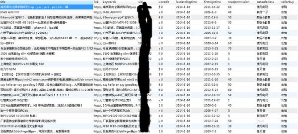 简单来说,就是用python写了个定向爬虫,抓了某个著名游戏论坛的二手区所有的发帖信息,包括帖子内容、发帖人信息等,基本上就是长这个样子: