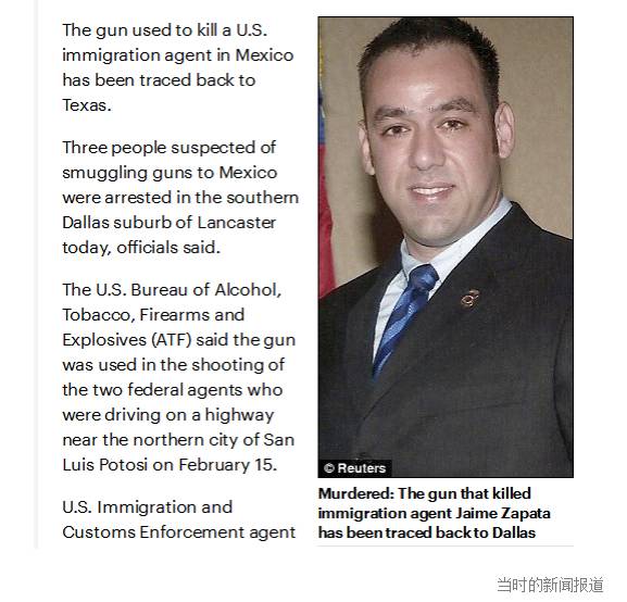 2011年2月15日,美国海关的一名年仅32岁的情报人员杰米· 萨帕塔,在墨西哥的一条高速公路上被一群毒贩射杀。