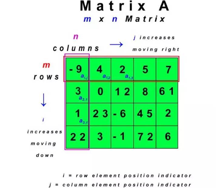 每个方格是矩阵中的一个元素。元素的位置使用小写斜体a和行序号i和列序号j来表示。