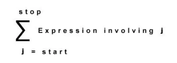 我们从底部的j开始,j是一个变量。然后将j代入到右边的表达式中。最后,我们将序列的结束数字写在顶部。看一个例子: