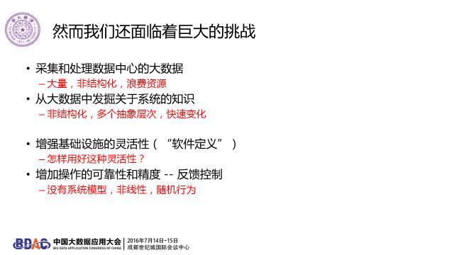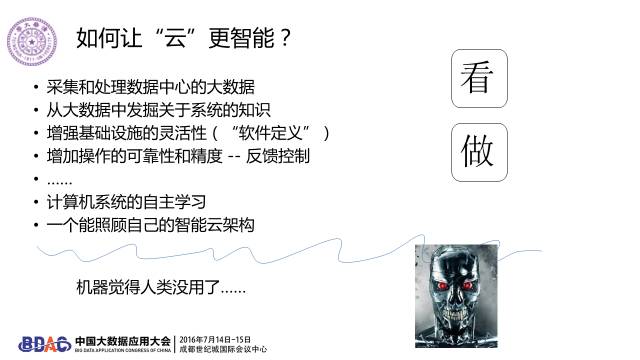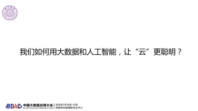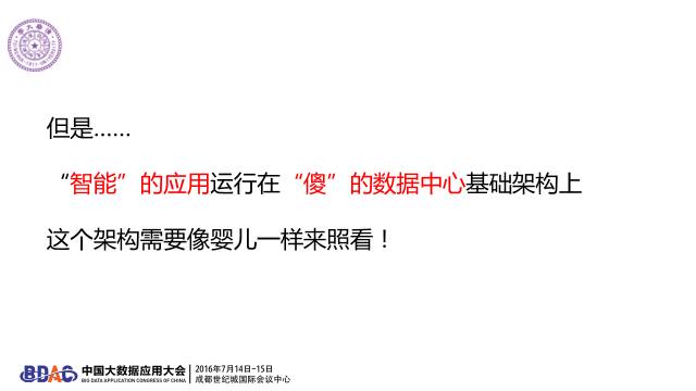 我今天讲的核心问题是,我们有最智能的应用,但是这些智能的应用是跑在最“傻”的数据中心基础架构上。什么领域用大数据用的最差的?就是我们自己的领域,就是云计算管理的领域。为什么这么说?