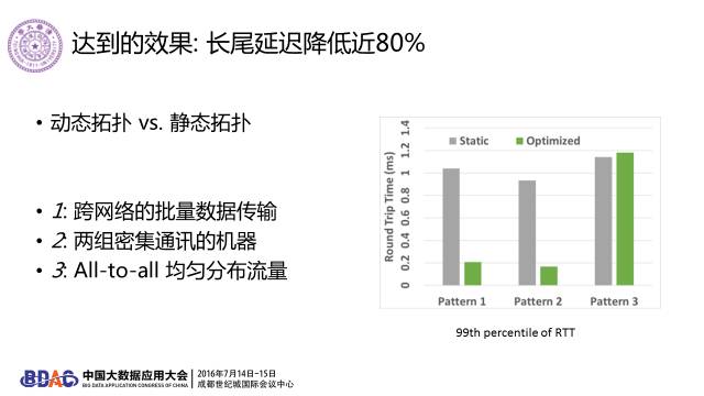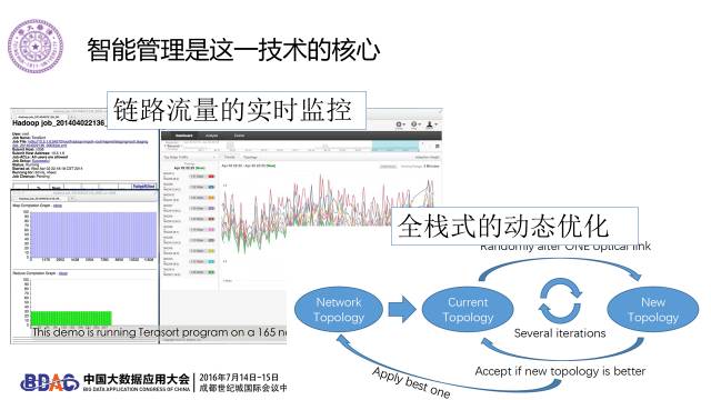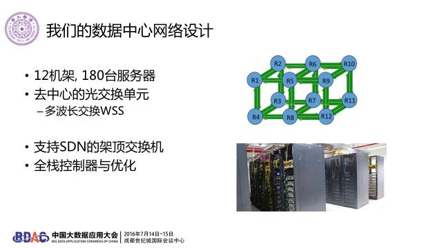 这里是我们设计的物理层可控的数据中心网络架构。通过对不同波长的光的控制,我们可以动态改变每条物理链路上的带宽。我们搭建了这个12机架,180节点的实验平台。