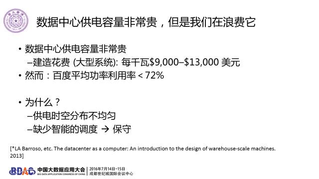 我举一个例子,比网络更加基础的基础设施就是供电。数据中心供电容量非常贵,你说要建一个10兆瓦的数据中心就要找10兆瓦的电容量来。百度有那么多计算需求,本来想放更多机器进到数据中心,但是它的数据中心平均功率利用率也就是72%就满了,不敢再放了,浪费了很多钱。