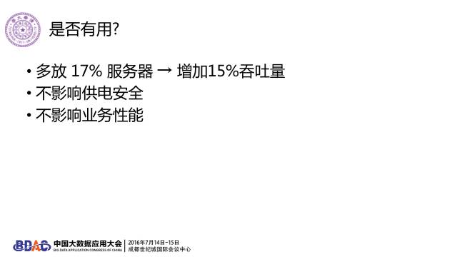 我们可以在同一个数据中心里,多放17%服务器增加15%吞吐量,不影响供电安全,不影响业务性能。大大节约了成本。