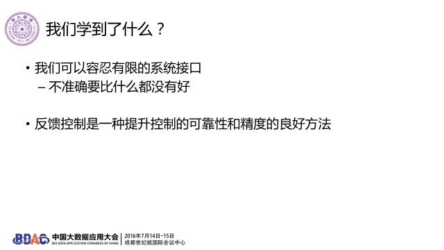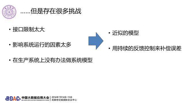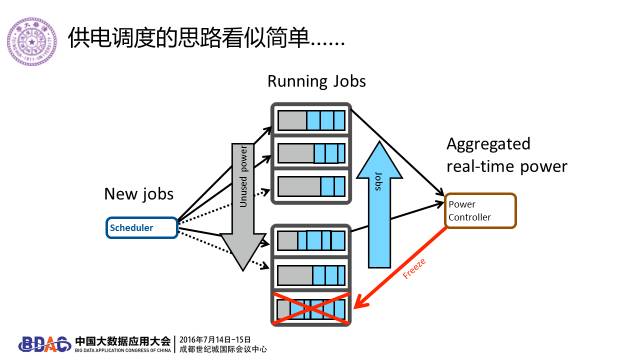 智能供电的挑战,一个是调度器的接口限制太大,例如我连我放的任务是什么都不知道。我不知道调度器还要用这个机器干什么,还要要用多少电。另外一个困难是,在生产系统上没有办法做系统模型。这种情况下,我们还能不能做任何的智能控制?我认为也是能的,只要把问题想清楚,可以用非常近似的模型,并且通过持续的反馈控制来补偿误差。