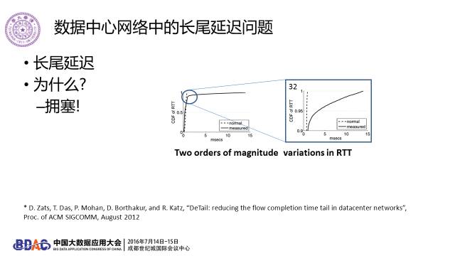 数据中心一个最大的问题是长尾延迟,数据中心网络大多数时候都很快。然而一个好的IT系统关心的是,有没有千份之一的请求是非常慢的。为什么关心这个?因为如果你一秒钟有一百万个用户访问,千份之一就意味着每一秒钟有一个用户觉得难以忍受。这个是不行的。