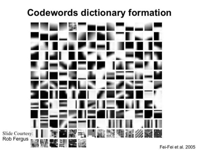 而相对来说,如果识别自行车,就会出现和车有关的图像块,如:车座、车梁。这些图像块就是“词”。这样就可以采用“词袋”方法。实际上,图像中的词不是我们说的这么直观,而是下方这样的图像小块。它是很底层的图像块,非常小,3*3,5*5或者7*7大小的图像块。这样小的图像块不表达很抽象的语义。