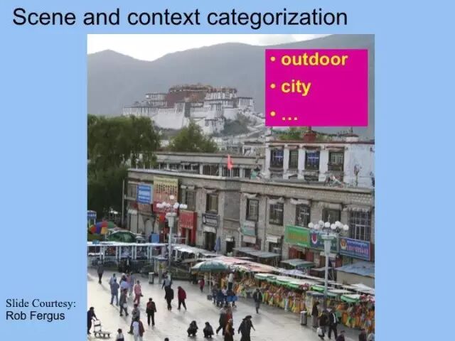 第三个问题是物体的分类和识别,指出这是山,这是树,这个是招牌,建筑。我们可能还会对整张图片做一个场景的分类,是在什么环境下拍照的。它可能是一个室外的图像,关于城市的生活等等。基本上这些就是我们在图像识别里面涉及到的一些可能的研究问题。