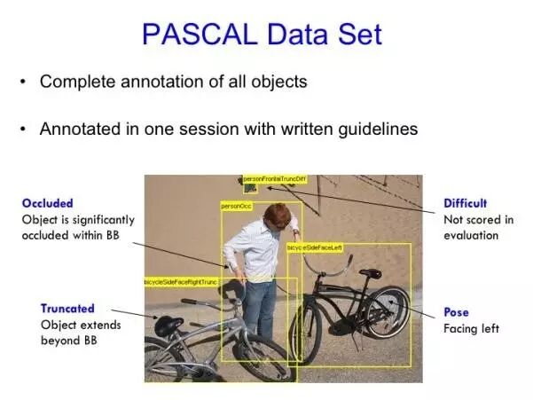 标数据是件头疼的事。例如这个数据库就要对每个物体用一个方框框起来,并给出一个类别标号。这是一些典型的图像,给每个物体都要框起来,都要标好这是什么物体。