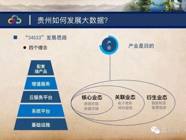 随后,我们在这“四个理念”的基础上,又在全国开创性地梳理了“基础设施层、系统平台层、云应用平台层、增值服务层、配套端产品层”五个层级产业链,明确了“核心业态、关联业态和衍生业态”三类业态,提出了三步走建设“大数据内容中心、大数据服务中心、大数据金融中心”三个中心的目标。我们认为,这三个中心,是贵州有可能达到的,需要“跳起来去摘桃子”的目标。