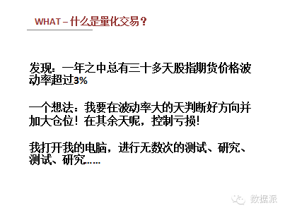 我们做量化交易,先要观察,找一些信号,有人就做观察,假设他看到“一年之中有很多天股指期货价格波动率超过3%”。于是他就有了一个想法,希望在波动率比较大的天判断好方向,加大仓位,在其余天控制亏损。他就打开他的电脑,进行无数次的研究、测试、再研究、再测试。