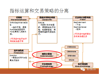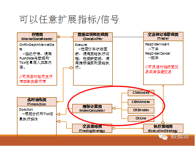 为了很方便地扩展指标和信号,可以设定一个指标计算的接口作为父类。具体的指标或者信号由接口派生出来,行情其实也可以作为一种特殊的指标或者信号。