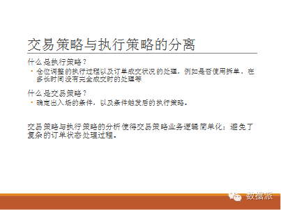 我们还要做交易策略和执行策略的分离,执行策略是描述我的单子怎么去执行的。例如我的单子特别大的时候,需要配合一些算法,把单子拆分成细的、小的单子;如果你一次把一个大单子放进去,别人就会看到了你的需求,他就会想怎么赚你的钱,这样不好。把单子拆小,让自己的冲击成本减少;而对于高频交易虽然不大需要单子的拆分,但是也要处理很多复杂的东西,比如说订单的成交细节和撤单细节等。