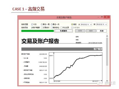 下面来讲量化交易的案例,这是一个实盘交易的帐户,在一年时间里从20多万做到了90多万,业绩相当不错。对高频交易来说,净值曲线比较直的往上走就是特点。另外一个特点:它的手续费交了84万,赚了60多万,手续费比赚的还多。大家看了以后有什么冲动?是不是很想去开赌场?高频交易策略的交易频率特别高,有时几秒就一次交易。