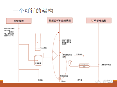 这是一个可行的架构,这个架构是真实交易的架构,分为几个线程。真实交易肯定是多线程的网络程序,有行情线程、订单回报线程,还有数据处理的线程。
