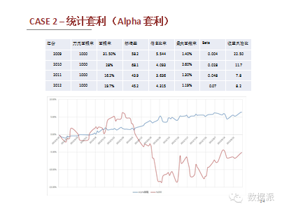 这是统计套利中的Alpha套利,蓝线描述的是Alpha套利的策略净值,红线描述的是沪深300。Alpha套利其实做了多空两个方向的对冲交易,尽量把市场风险暴露控制到最小,也是追求持续稳定的盈利。看图中表格,我推荐大家策略做分年的测试,看看每年的策略的情况,以及策略适应性的大体趋势。我对期货比较熟悉,一般数据会是这样的走势。