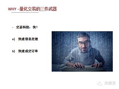 我们需要交易科技达到快,这就需要你快速地搜集数据,快速地分析数据,快速地发出指令,这些要求你要有一些通讯技术以保障快速的网络连接,同时应该把计算机系统优化,还可以考虑如何用硬件把它加速。