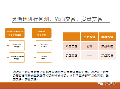 交易接口也有两个派生,一个是下单通过网络报出去,一个是下单下到文件里。这样回测、纸面交易和实盘交易的实现就是搭不同的积木。回测是把历史数据灌进来,下单到文件,最后统计一下回测结果好不好。真实的交易无非是听真实的行情,把单子报到网络中去。纸面交易则是听取真实的行情,下单下到文件中去。
