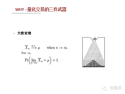 量化交易的三件武器:第一件,也是最重要的,量化交易是以大数定律来挣钱。大数定律是我们在大二的时候就学过,我们把每次交易看成是一次赌博,这是一个事件,这个事件是随机变量,如果随机变量的均值能够覆盖成本,我就觉得我有信息优势,我就愿意参加这个赌博;如果覆盖不了成本,你就不要做了,做的越多亏的越多。