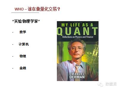 谁在做量化交易?其实某种程度上做量化交易的这些人,可以说是实验物理学家,不停做实验、测试、修正,同时特别强调要有实验物理的精神。图中这位大佬就是以前学物理的,后来去做quant。