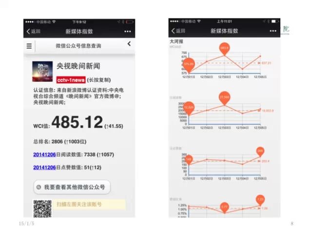 我们在手机上,这个微信公号本身就有一个查询系统,在微信里面你可以直接查到相关的结果。央视晚间新闻WCI值485.12,我们刚刚从9月20号开始做,相对比较原始,今后这个系统会有很多变化。