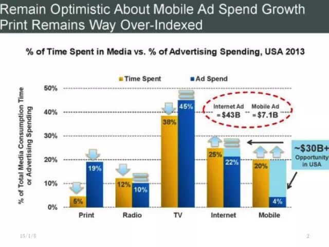 2014年整体的媒体生态已经跟以前有很大的区别了。在移动互联网上面存在着很大的变化。艾瑞米克在他的统计中,美国人在电视消耗的时间是38%,广告的投入是45%。在移动端,消耗的时间是20%,但是广告的投入是4%。