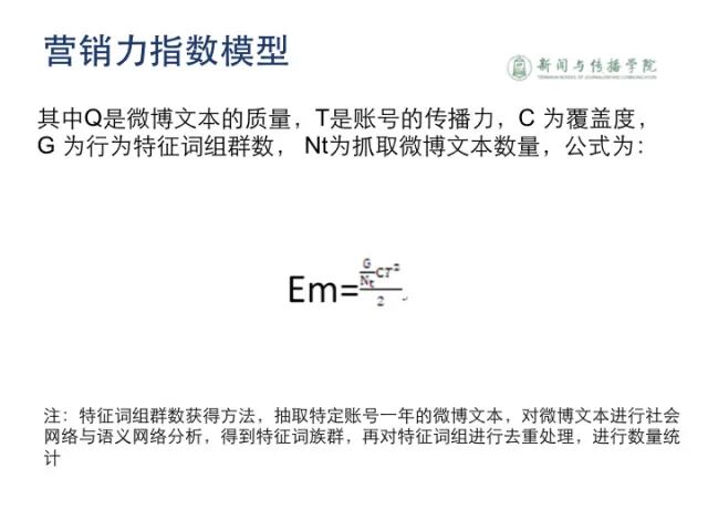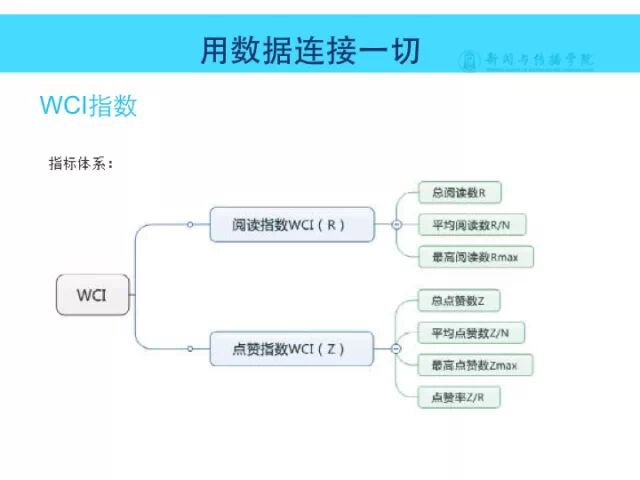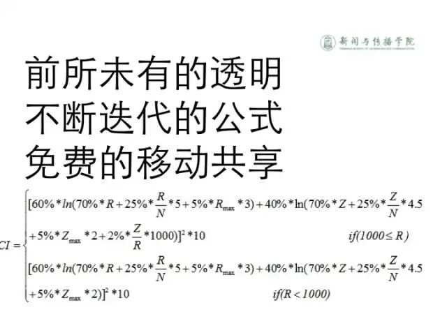 这是我们对WCI的评价公式。这个公式是9.0版本。为什么这里要分两段?前面的公式都是一段,为什么这里要分两段。因为我们在实践中发现,当我们用WCI评价所有微信公号的时候,头部的数据都是正常的,但是到了尾部数据就不正常了。