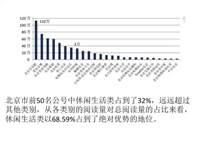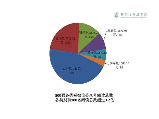 我们自身利用这些数据平台也做了简单的分析,目前我们只做了三个月,没有特别高质量的国际研究。但是我们现在做的基本是简单的统计。希望到了明年上半年我们能够出一些比较有价值、深度的研究。对前面五百强的微信公号我们做了分析,科技类占到阅读数多少,文化类占多少,资讯类占多少。