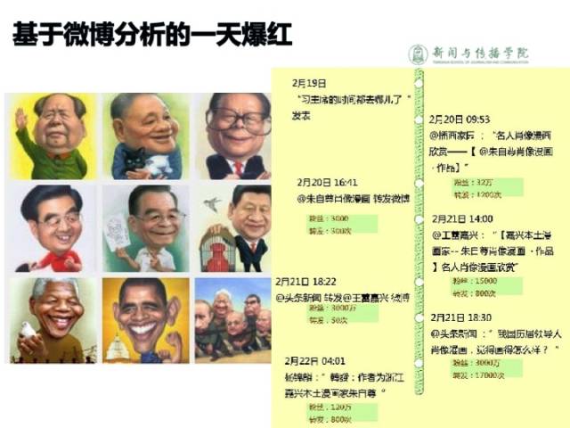 如果我们用大数据去分析,传播风暴是怎么兴起的。比如说嘉兴市一个漫画家叫朱自尊,他画了比较好的漫画,习总把权利关进制度的笼子,他转发以后,被工梦嘉兴转发了,又被我抓发了,然后又被别人转发了。这个漫画就火了。