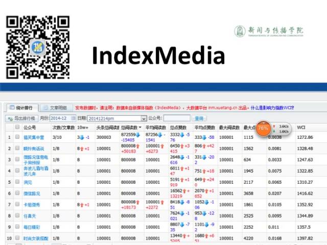 首先是数据,我们做了一个平台,叫做新媒体的指数。这个平台我们现在在这个地方可以看到inm.xuetang.cn。有了这些数据以后,我们先去架构一些影响力的指数。第一个指数我们把它叫做WCI,微信的传播指数。拿到数据以后可以对它做一个综合的测量,这里面的数据我们可以对它进行每天的测量,阅读数、点赞数等等进行分析,然后给他一个评价。