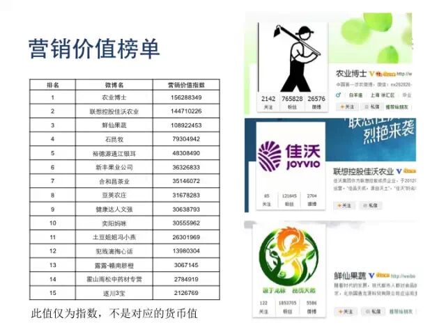 这里我们也对农业营销能力做了评估。对微博中一千多个研究对象做了细化。每一个跟农业相关德新农人、新农商的能力,我们给了一个简单共识。